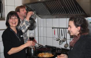 Thilo ist der Hüter der Röstpfanne: Langsam rührt er durch den Haufen sich goldbraun färbender Sonnenblumenkerne. Es riecht immer besser. Rahel gibt jetzt Rote-Bete-Würfel für das Nudelpesto hinzu. Die kernigen Roten Bete und knusprigen Sonnenblumenkerne lassen Fleisch vergessen. Zur Stärkung gibt's die ersten fertigen Grünkohl-Chips und ein Glas Rotwein.